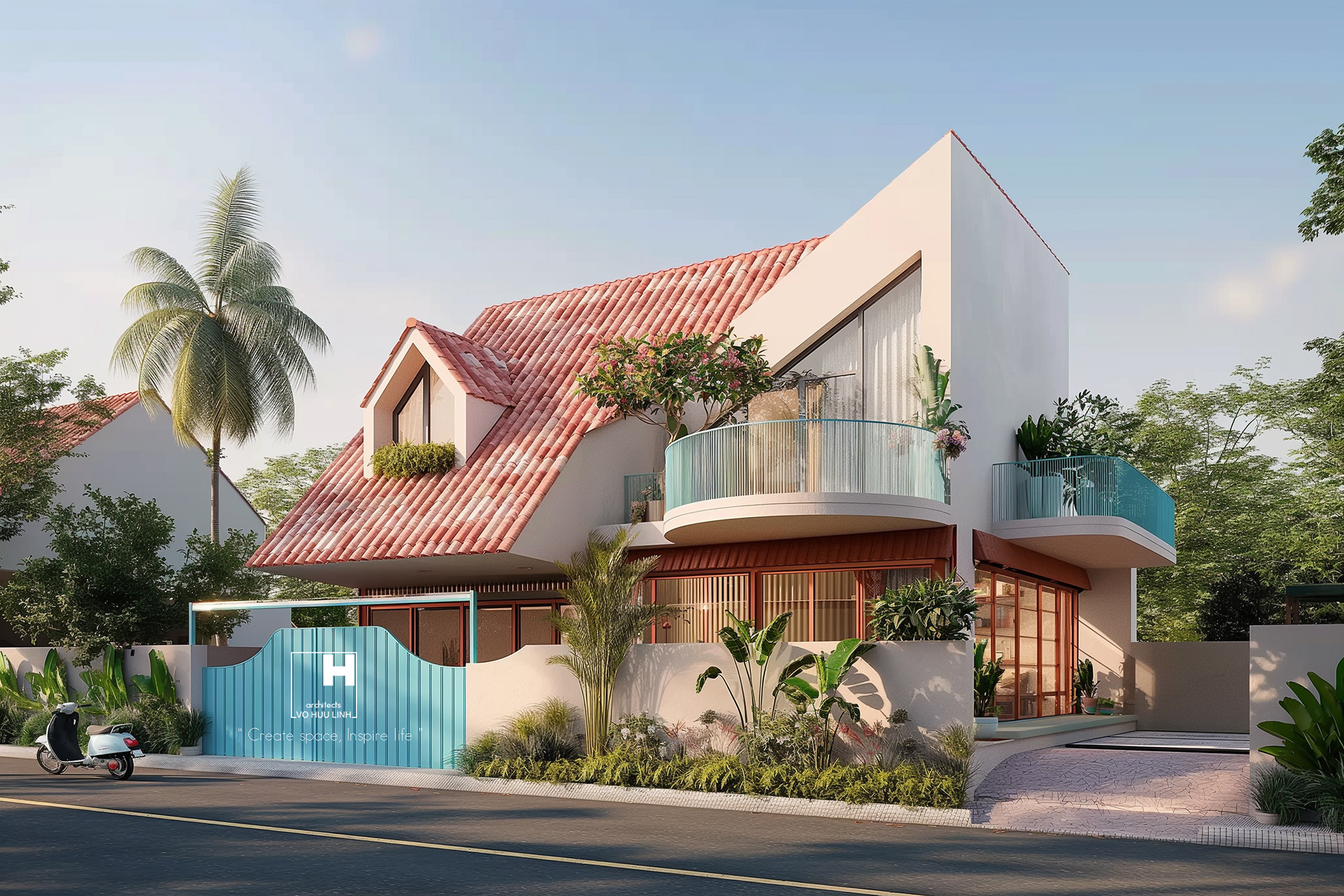 Lấy cảm hứng từ kiến trúc truyền thống: hàng hiên, mái ngói nghiêng, cửa lá sách,...Kết hợp với ngôn ngữ kiến trúc hiện đại tạo sự hài hòa, tinh tế. Tỉ lệ cân đối, bố trí hợp lý, mang đến sự bình yên, thư thái. Trong nhà và trên tầng tràn ngập thiên nhiên. Hệ thống thông tầng, kết nối các không gian sinh hoạt chung. Hàng hiên, ban công ngăn cách bên trong và bên ngoài, điều hòa không khí. Nội thất với Vật liệu tự nhiên: gỗ, đá mài. Màu sắc Cung Đình, . Mang đến cảm giác thanh lịch, thư thái, sang trọng và trang nhã